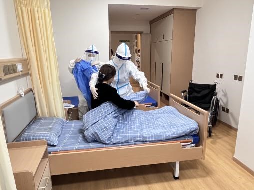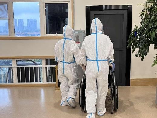 5、護(hù)士及醫(yī)生做好防護(hù)進(jìn)入發(fā)熱長(zhǎng)者居室,幫助長(zhǎng)者穿戴隔離衣并佩戴口罩,通過隔離轉(zhuǎn)運(yùn)專用電梯,將發(fā)熱患者轉(zhuǎn)移至負(fù)壓救護(hù)車內(nèi);